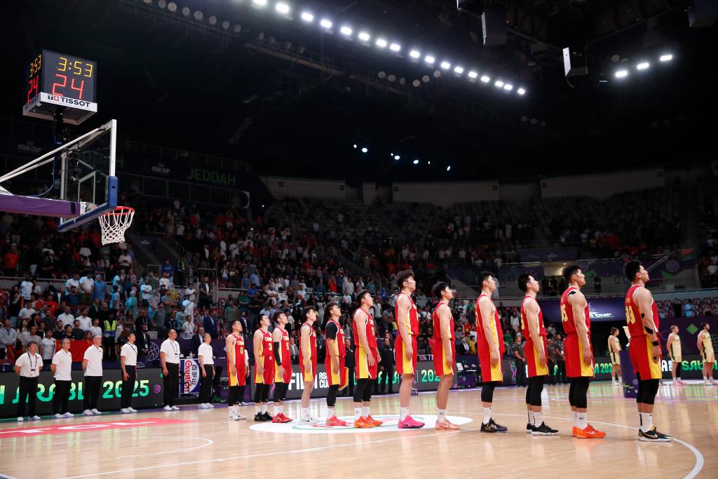 8月17日,在沙特阿拉伯吉达举行的2025国际篮联亚洲杯决赛中,中国队89比90不敌澳大利亚队,获得亚军。图为中国队球员在赛前奏唱国歌仪式上列队。篮球日报记者 王东震 摄