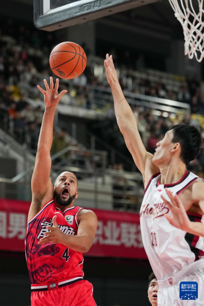1月8日,广州朗肽海本队球员托马斯(左)在比赛中上篮。