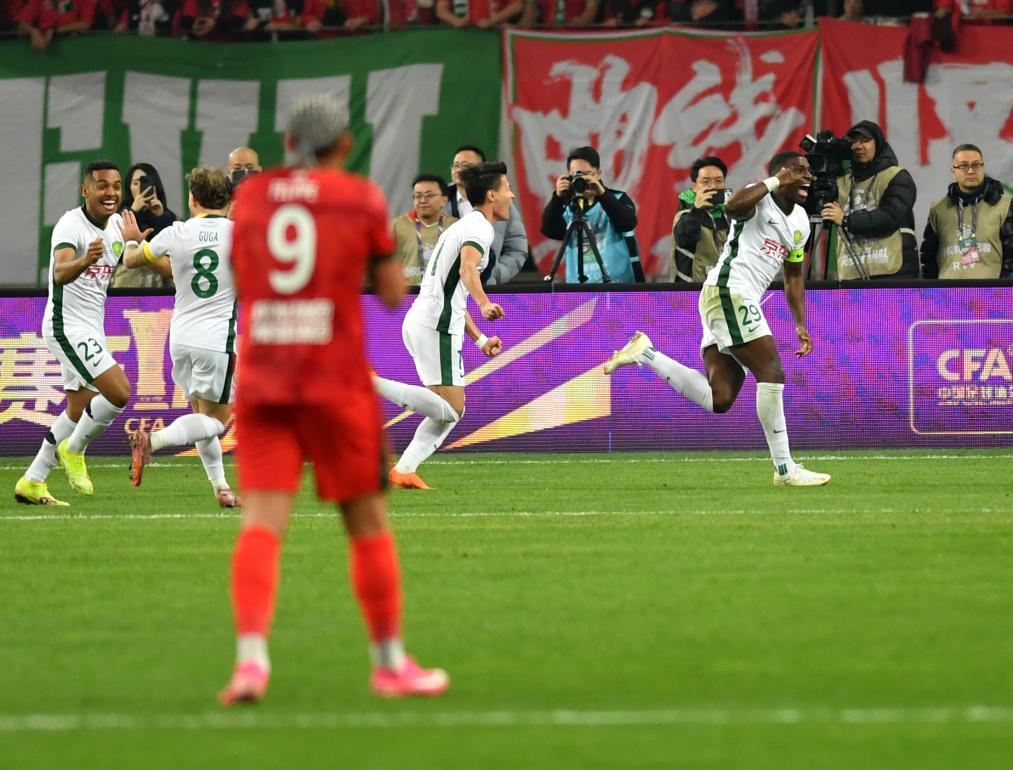 12月6日,北京国安队球员法比奥(右一)在比赛中庆祝进球。体育日报记者 李嘉南 摄