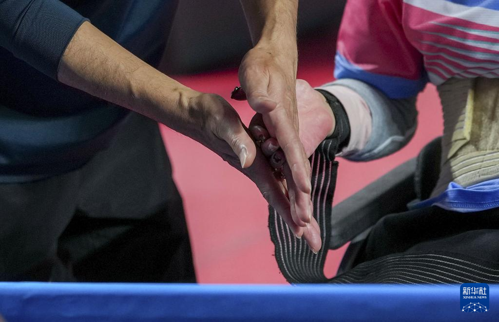 12月11日,吉林队选手孙晨璐的父亲孙长梅(左)在TT1女子单打四分之一决赛中为女儿按摩手部。最终,孙晨璐1比3不敌山西队选手杨东梅。
