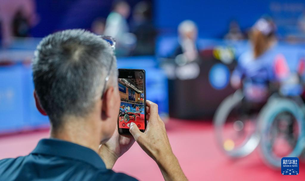 12月11日,吉林队选手孙晨璐的父亲孙长梅在TT1女子单打四分之一决赛中用手机记录女儿比赛画面。最终,孙晨璐1比3不敌山西队选手杨东梅。