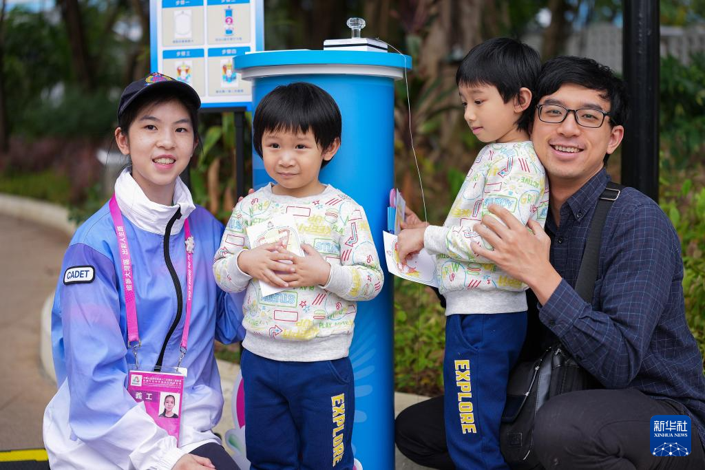 12月14日,香港高中生义工叶钰莹(左一)与前来观赛的观众合影。叶钰莹就读于香港荃湾区的一所高中,前来义工服务点单程通勤就要一个多小时,收工后还得赶去上补习班。即便如此,她依旧愿意挤出时间参与义工服务。在互动区里,她负责为观众盖纪念章,每当收到观众的感谢与赞许,小姑娘的脸上总会露出会心的笑容。“老师鼓励我们多和社会建立连接,我也从义工服务中收获了温暖与能量,这是书本里学不到的东西。”
