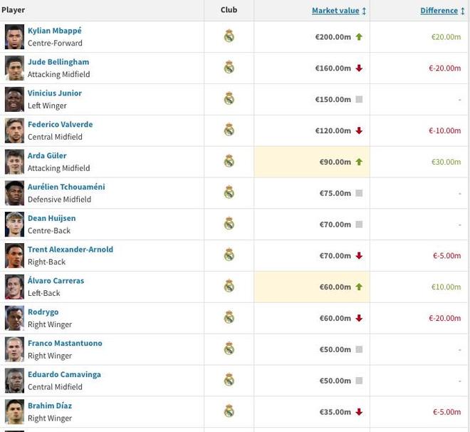 北京时间12月12日法甲日报,德转市场更新西甲球员身价,皇马队内姆巴佩较上期上升2000万欧,目前身价2亿欧,贝林厄姆下降2000万欧至1.6亿欧。