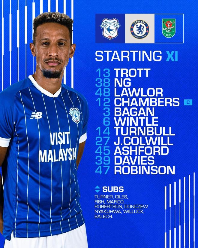 卡迪夫城首发:13-特罗特、38-黄添喜、48-劳勒、12-钱伯斯、3-巴甘、6-温特尔、14-特恩布尔、27-科尔威尔、39-戴维斯、45-阿什福德、47-卡勒姆-罗宾逊
