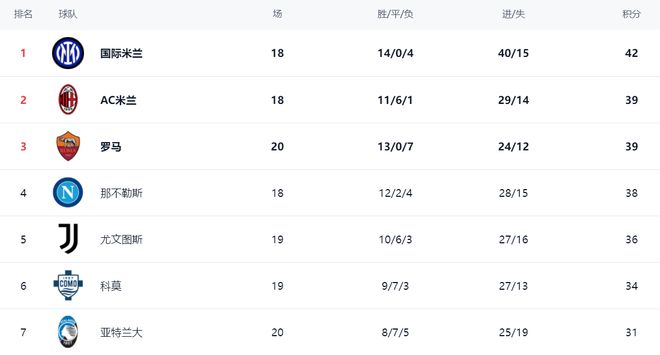 在积分榜上,国际米兰以42分排名榜首。AC米兰39分排名第2。罗马赢球之后,总积分也是39分,升到第3名。不过,罗马比AC米兰多踢了2场比赛,要想进一步提升排名并不简单。那不勒斯38分排名第4。第5的是尤文图斯,拿到了36分。科莫只收获平局,总积分是34分,排名第6。亚特兰大排名不断上升,总积分现在达到31分,排名第7。
