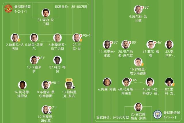 卡里克率队重回四后卫体系,姆伯莫单箭头、身后是阿马德-迪亚洛、B费、多古。瓜帅派出哈兰德突前,过人高手多库和塞梅尼奥分列两侧。