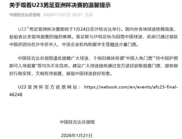 1月21日晚,中国驻吉达总领事馆发文,针对一些自媒体博主在短视频平台发布的所谓“中国驻吉达总领事馆和沙特足协为中国球迷提供免费门票、持中国护照即可入场观赛”等内容,总领馆表示,上述内容均为不实信息。