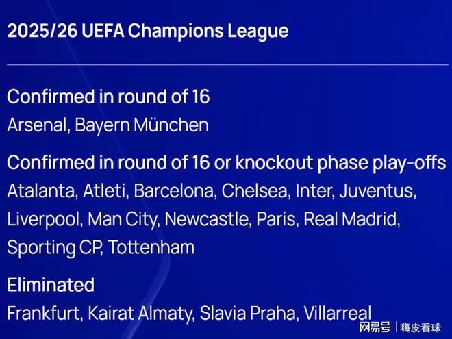 另外还有13支球队提前出线,至少可以获得16强附加赛的资格,包括英超的利物浦、热刺、纽卡斯尔、切尔西和曼城,西甲的皇家马德里、巴塞罗那和马德里竞技,意甲的亚特兰大、国际米兰和尤文图斯,法甲的巴黎圣日耳曼,以及葡超的葡萄牙体育。
