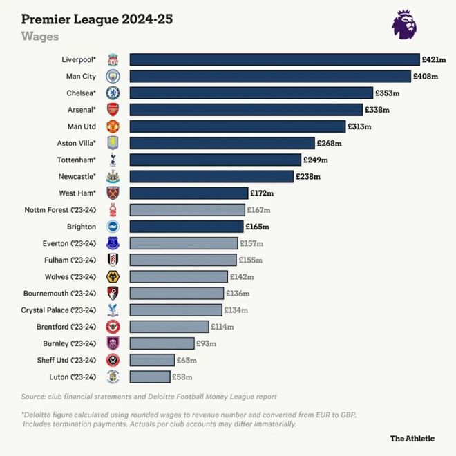 The Athletic:曼联24/25赛季的工资支出排名英超第5
