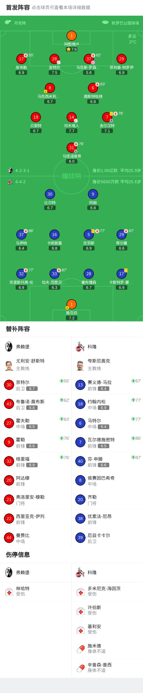 弗赖堡2-1逆转科隆,马塔诺维奇破门,舍尔汉特建功